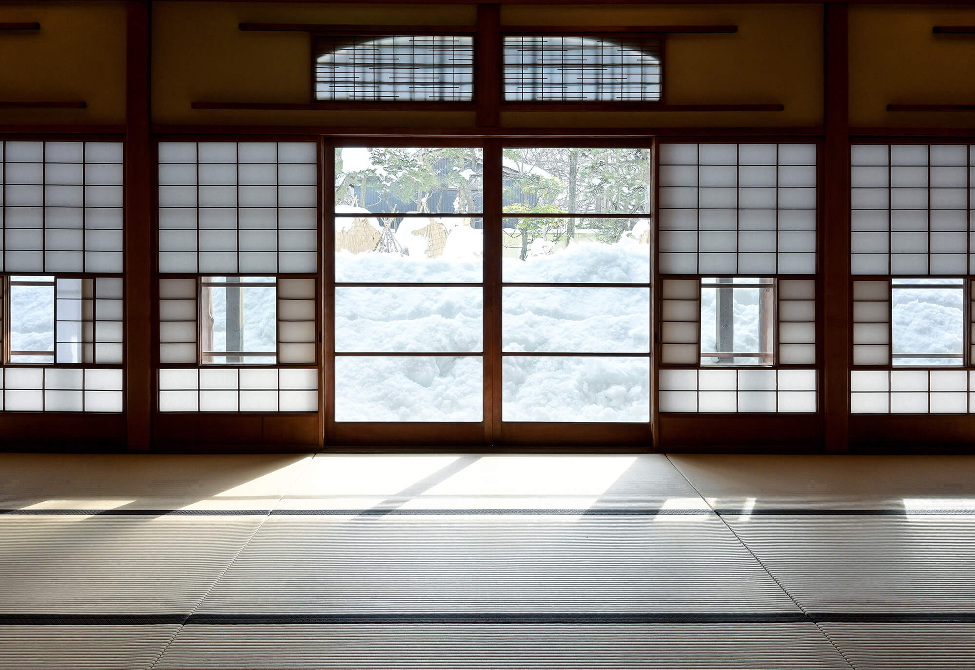 庭に面した縁側のガラス戸の前に並んでいる雪見障子。この数日前に降った20年ぶりの大雪のせいで、屋根から落ちてきた雪が縁側に降り積もってこれぞまさに真の雪見障子に。