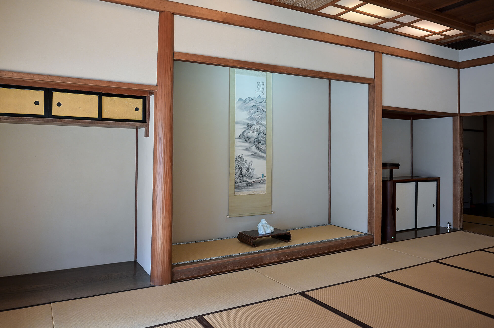 「床の間」とは、和室の中で掛け軸が飾ってある、床が一段高く作られている空間のことを指します。床の間に立っている柱を「床柱」と呼びますが、通常は一本、たまに二本立っています。この部屋には丸太の皮を剥いで磨いた柱と、四面に柾目が出るように角材にした柱の二本が立っています。