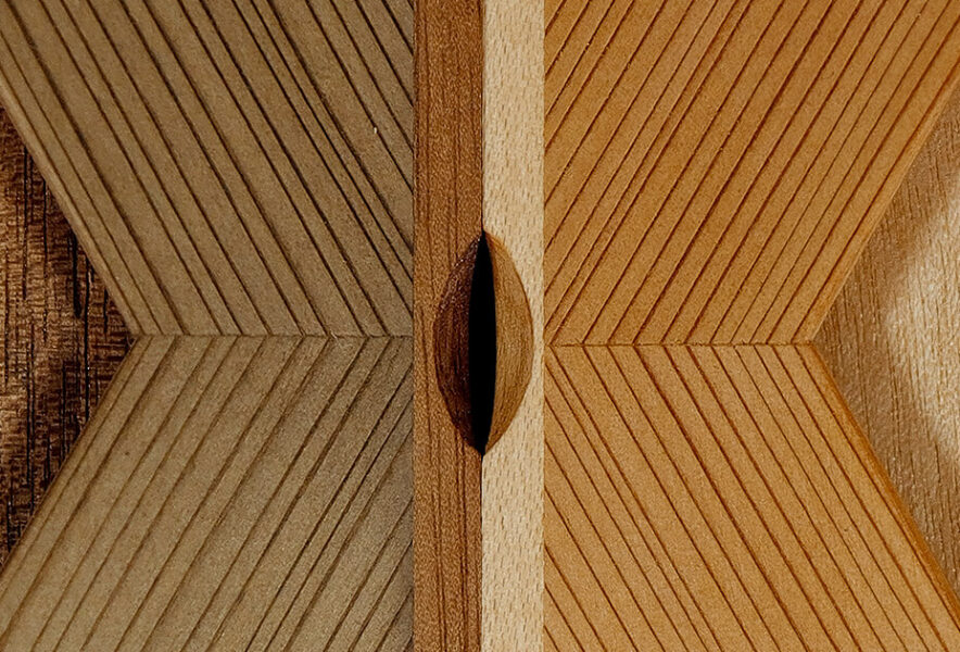 秋田県産のカバザクラ(マカバ)と、天然秋田杉の上品な赤身がマッチした、気品を感じる一品です。レギュラー商品のカバザクラ×秋田杉も、秋田美人のように色白で、上品な仕上がりが人気ですが、こちらは天然秋田杉ならではの、美しい緻密な柾目の存在感が一段と際立っています。その柾目をV字に貼り合わせた職人泣かせのデザイン。今回当社一押しのモデルです。